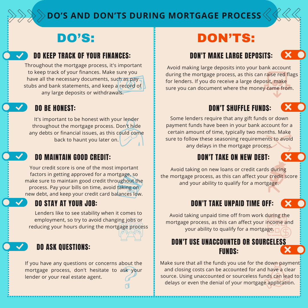 Yes, there are both things you should avoid and things you should do while in the mortgage process to ensure a smooth and successful transaction!
